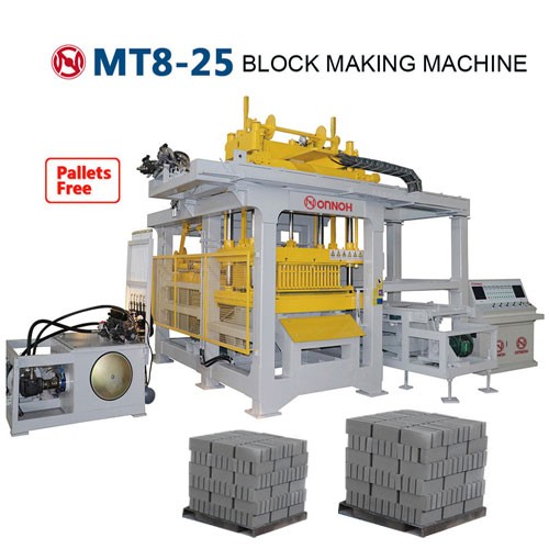 MT8-25 pallets free block making machine with PLC controller,the whole working process is automatic.It can make different blocks by changing mould like hollow,paver,solid,interlocking and others color face bricks.